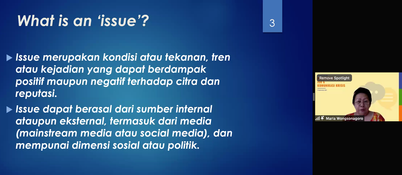 Dijelasakannya pula, pentingnya pembuatan laporan isu dalam komunikasi krisis. “Pelaporan isu penting untuk dibuat agar setiap isu yang muncul terkait organisasi dapat dipetakan dan ditangani dengan baik. Jangan pernah meremehkan sebuah isu yang muncul,” jelas Maria.