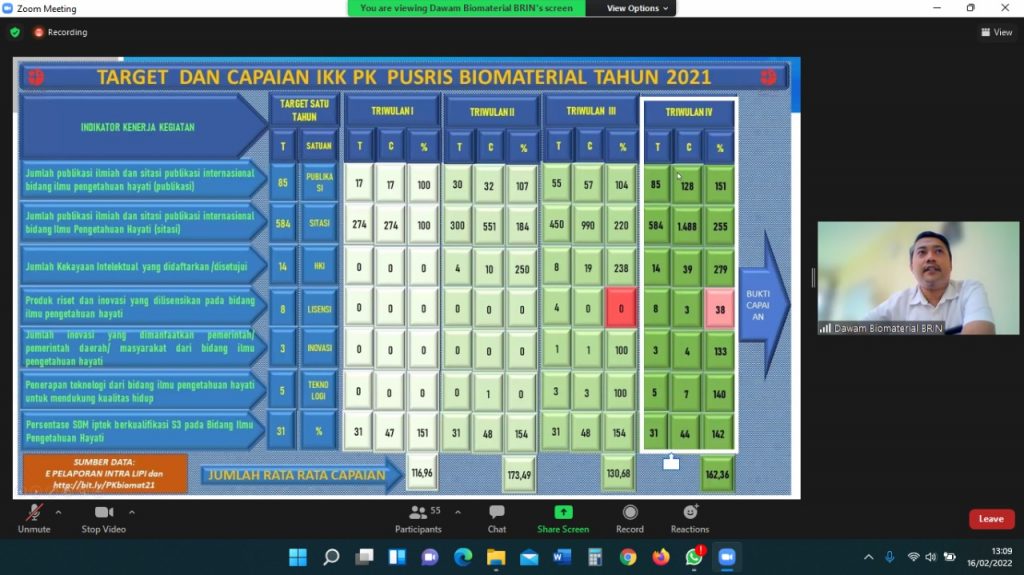 Dalam rapat yang dihadiri secara daring oleh seluruh sivitas Pusat Riset Biomaterial BRIN tersebut, Dawam juga menjelaskan target dan capaian Pusat Riset Biomaterial pada tahun 2021. “Dari tujuh indikator kinerja kegiatan, capaian tertinggi adalah jumlah kekayaan intelektual yang didaftarkan/disetujui sebanyak 39 HKI (279%), jumlah publikasi ilmiah internasional sebanyak 128 publikasi (151%), jumlah sitasi publikasi internasional sebanyak 1.488 sitasi (255%), persentase SDM iptek berkualifikasi S3 sebanyak 44%, penerapan teknologi untuk mendukung kualitas hidup sebanyak 7 teknologi (140%), dan jumlah inovasi yang dimanfaatkan pemerintah/pemerintah daerah/masyarakat sebanyak 4 inovasi (133%),” urai Dawam.