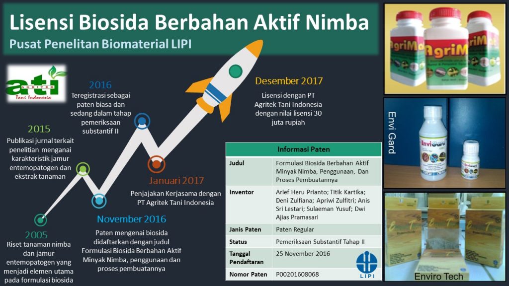 Sebagai komitmen untuk terus mengembangkan riset yang aplikatif di masyarakat, Pusat Penelitian Biomaterial LIPI telah menjalin lisensi dengan PT Agritek Tani Indonesia yang didasarkan pada pengembangan Biopestisida dengan berbahan dasar alami seperti minyak Nimba dan jamur entemopatogen. Riset terkait komponen aktif dalam biosida ini sudah dilakukan sejak tahun 2005 dan mulai dihasilkan publikasi terkait karakteristik jamur entemapatogen dan ekstrak tanaman Nimba sampai dengan tahun 2015. Pada bulan November 2016 paten yang berjudul “Formulasi Biosida Berbahan Aktif Minyak Nimba, penggunaan dan proses pembuatannya” mulai didaftarkan dan teregistrasi sebagai paten regular di tahun yang sama. Update status paten saat ini (tahun 2020) berada dalam tahap pemeriksaan substantif tahap II. Penjajakan Kerjasama dengan PT Agritek Tani Indonesia mulai dilakukan pada awal tahun 2017 dan disepakati lisensi yang bersifat non-eksklusif senilai 30 juta rupiah pada Desember 2017.
