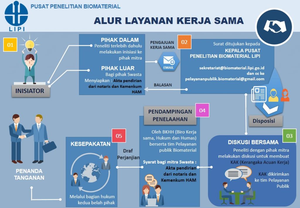 Info lebih lanjut dapat menghubungi kami di Nomor WA: +628118612391 atau alamat email sekretariat@biomaterial.lipindonesia.com dan pelayananpublik.biomaterial@gmail.com. Prosedur layanan kerjasama terdapat pada infografis diatas.