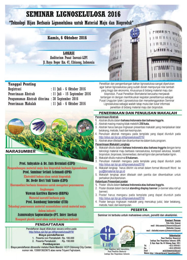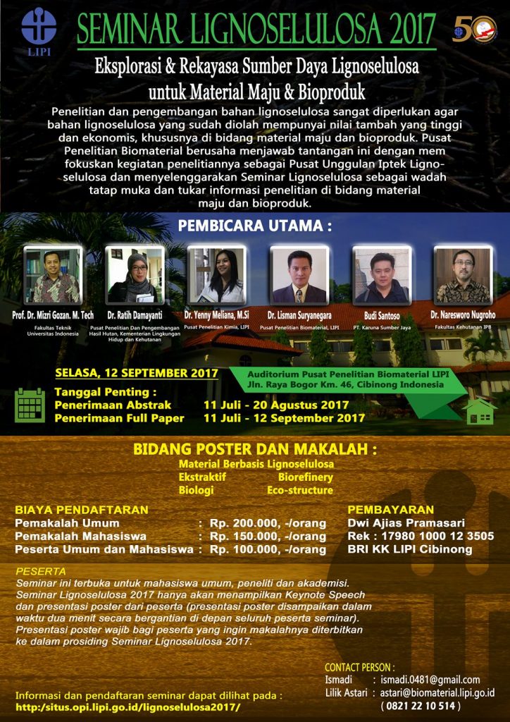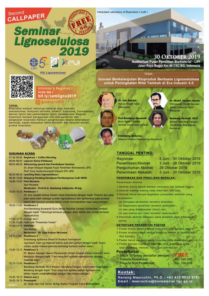 Pusat Penelitian Biomaterial berusaha menjawab tantangan ini dengan memfokuskan kegiatan penelitiannya sebagai Pusat Unggulan Iptek Lignoselulosa dan menyelenggarakan Seminar Lignoselulosa sebagai wadah tatap muka dan tukar informasi penelitian di bidang material maju dan bioproduk. Seminar Lignoselulosa yang dilaksanakan merupakan upaya untuk mengakselerasi peran dan sinergi para peneliti dari lembaga penelitian maupun akademisi dari perguruan tinggi di Indonesia. Bentuk acara seminar selain pemaparan dari para ahli dibidang biomaterial dan lignoselulosa dan diskusi terdapat juga pemaparan penelitan-penelitian terbaru dibidang biomaterial melalui presentasi poster. Dimana poster yang telah dipresentasikan akan menjadi prosiding seminar lignoselulosa setiap tahunnya, maupun beberapa poster terpilih akan diterbitkan pada Journal of Lignocellulose. Seminar pertama kali diadakan pada tahun 2016 dan selalu rutin dilaksanakan setiap tahunnya sampai dengan tahun 2019.