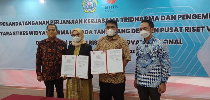 Cibinong, Humas BRIN. Badan Riset Inovasi Nasional (BRIN) terus membuka kerja sama bidang riset dan pengembangan dengan berbagai pihak, termasuk dengan Perguruan Tinggi baik negeri maupun swasta. Pada Kamis (19/05), BRIN melalui Pusat Riset Vaksin dan Obat (PRVO), Organisasi Riset Kesehatan (ORK), menyepakati kerja sama tentang Penelitian dan Pengembangan di Bidang Farmasi Bahan Alam dan Mikrobiologi dengan Sekolah Tinggi Ilmu Kesehatan (STIKes) Widya Dharma Husada Tangerang. Penandatanganan naskah kerja sama dilakukan secara tatap muka, bertempat di Aula Lantai 8 STIKes Widya Dharma Husada, Jl. Pajajaran No. 1 Pamulang, Tangerang Selatan.