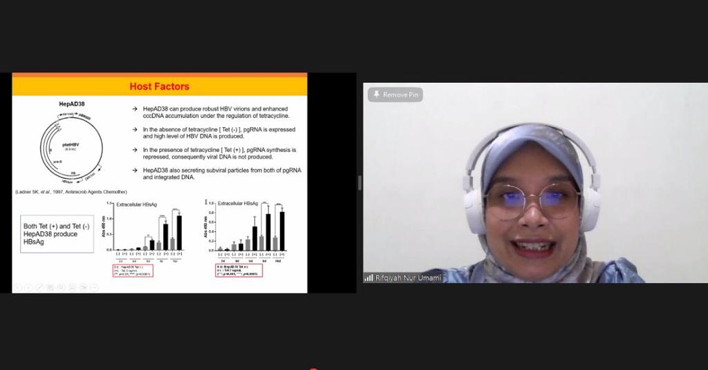 Rifqiyah menyampaikan bahwa pada tahap awal risetnya fokus pada pengaruh mutasi Basal Core Promoter (BCP) terhadap sekresi HBsAg secara in vitro.