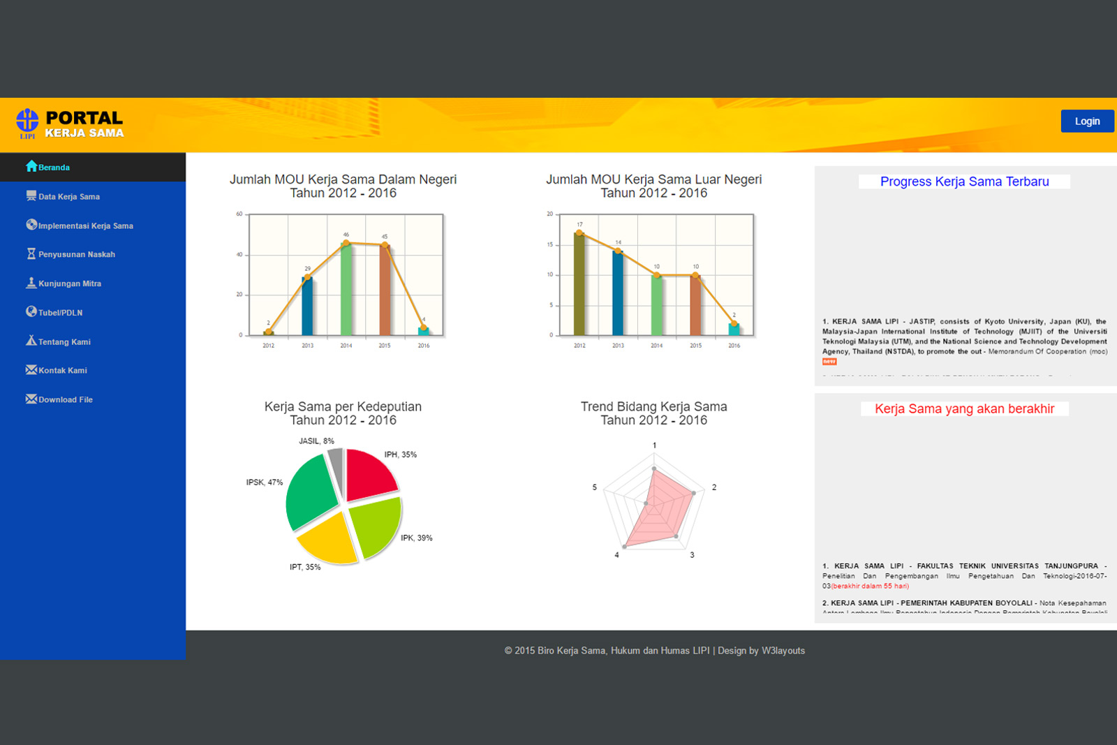 Sebagai lembaga riset nasional yang mempunyai visi untuk menjadi lembaga riset berkelas dunia, LIPI banyak menjalin kerja sama baik dengan mitra dalam dan luar negeri. Portal kerja sama ini merupakan system database kerja sama dan implementasinya yang dibuat oleh BKHH untuk melakukan tracking kerja sama yang telah dilaksanakan. Pengguna bisa mendapatkan informasi tentang kerja sama tersebut bahkan bisa mengunduh naskah kerja sama.