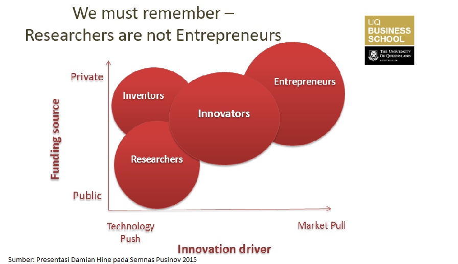 Damian Hine dalam presentasinya pada Seminar Nasional Technopreneurship dan Alih Teknologi di Pusat Inovasi – LIPI (November 2015) melakukan jeda pada sebuah paparan yang mungkin dianggapnya penting bagi para Peneliti. Penekanan dalam pemaparan diartikan sebagai sebuah tampilan yang perlu mendapat perhatian khusus, bahwa peneliti bukan wirausaha.
