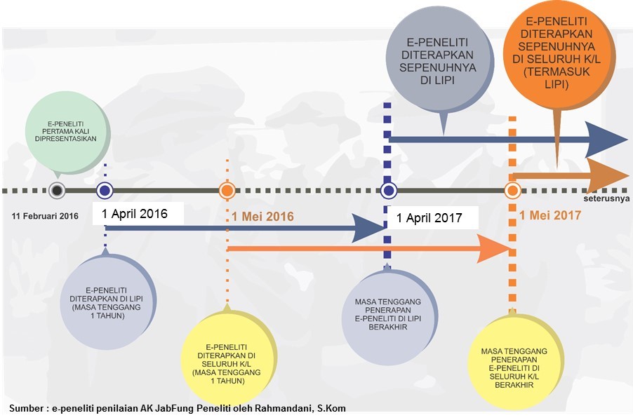 Berdasarkan informasi dari “materi Sosialisasi 3 Pilar dan E-Peneliti” diketahui bahwa :Jadwal penerapan e-peneliti sebagai berikut:1. E-peneliti diterapkan di LIPI (Masa Tenggang, 1 tahun) : 01-04-2016 sampai 01-04-2017. 2. E-peneliti diterapkan di seluruh Kementrian dan Lembaga (K/L) (Masa Tenggang, 1 tahun) : 01-05-2016 sampai 01-05-2017. 3. E-peneliti diterapkan sepenuhnya di LIPI : 01-04-2017. 4. E-peneliti diterapkan sepenuhnya di seluruh K/L : 01-05-2017. pada no 1 dan 2 yaitu masa tenggang berlaku sebagai berikut :untuk kandidat peneliti pengajuan fungsional wajib menggunakan e-peneliti, sedangkan Peneliti Pertama s/d Utama untuk kenaikkan pangkat masih dapat menggunakan konvensional. E-peneliti akan diberlakukan sepenuhnya untuk seluruh K/L dan LIPI setelah masa tenggang berakhir yaitu berlaku dari 1 Mei 2017.