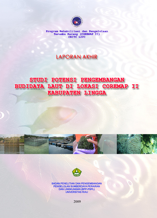 Sebagai langkah pertama untuk mendukung pengembangan budidaya laut perlu dilakukan studi yang berhubungan dengan penentuan lokasi, kelayakan ekonomi dan finansial, teknik budidaya, skala usaha dan pola pengembangannya. Untuk itu perlu dilaksanakan suatu kegiatan Studi Potensi Pengembangan Budidaya Laut di Lokasi Coremap II Kabupaten Lingga.