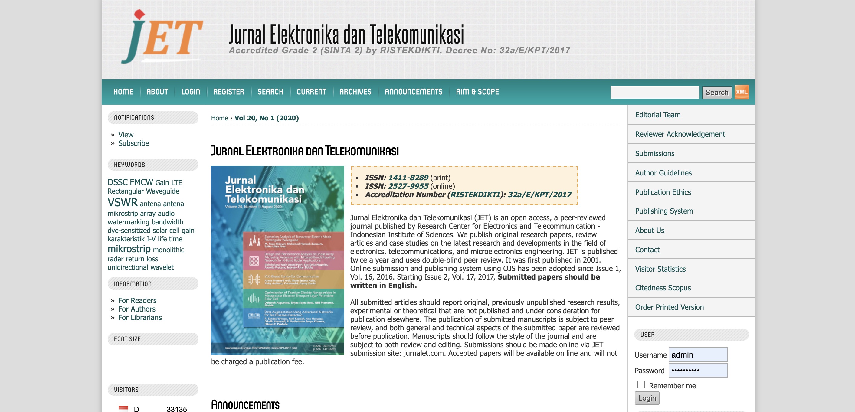 Jurnal Elektronika dan Telekomunikasi (JET) is an open access, a peer-reviewed journal published by Research Center for Electronics and Telecommunication - Indonesian Institute of Sciences. We publish original research papers, review articles and case studies on the latest research and developments in the field of electronics, telecommunications, and microelectronics engineering