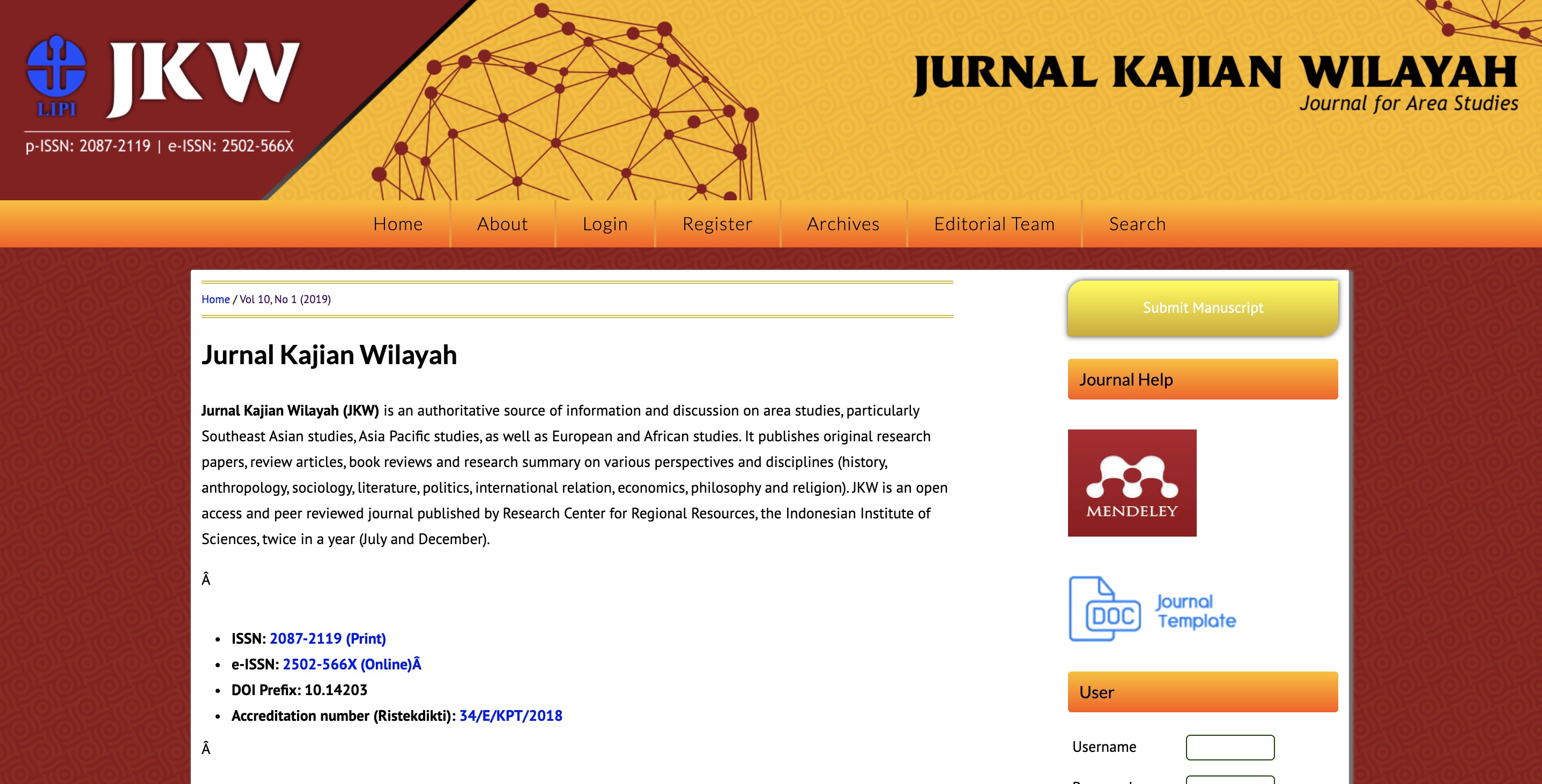 Jurnal Kajian Wilayah (JKW) is an authoritative source of information and discussion on area studies, particularly Southeast Asian studies, Asia Pacific studies, as well as European and African studies. It publishes original research papers, review articles, book reviews and research summary on various perspectives and disciplines