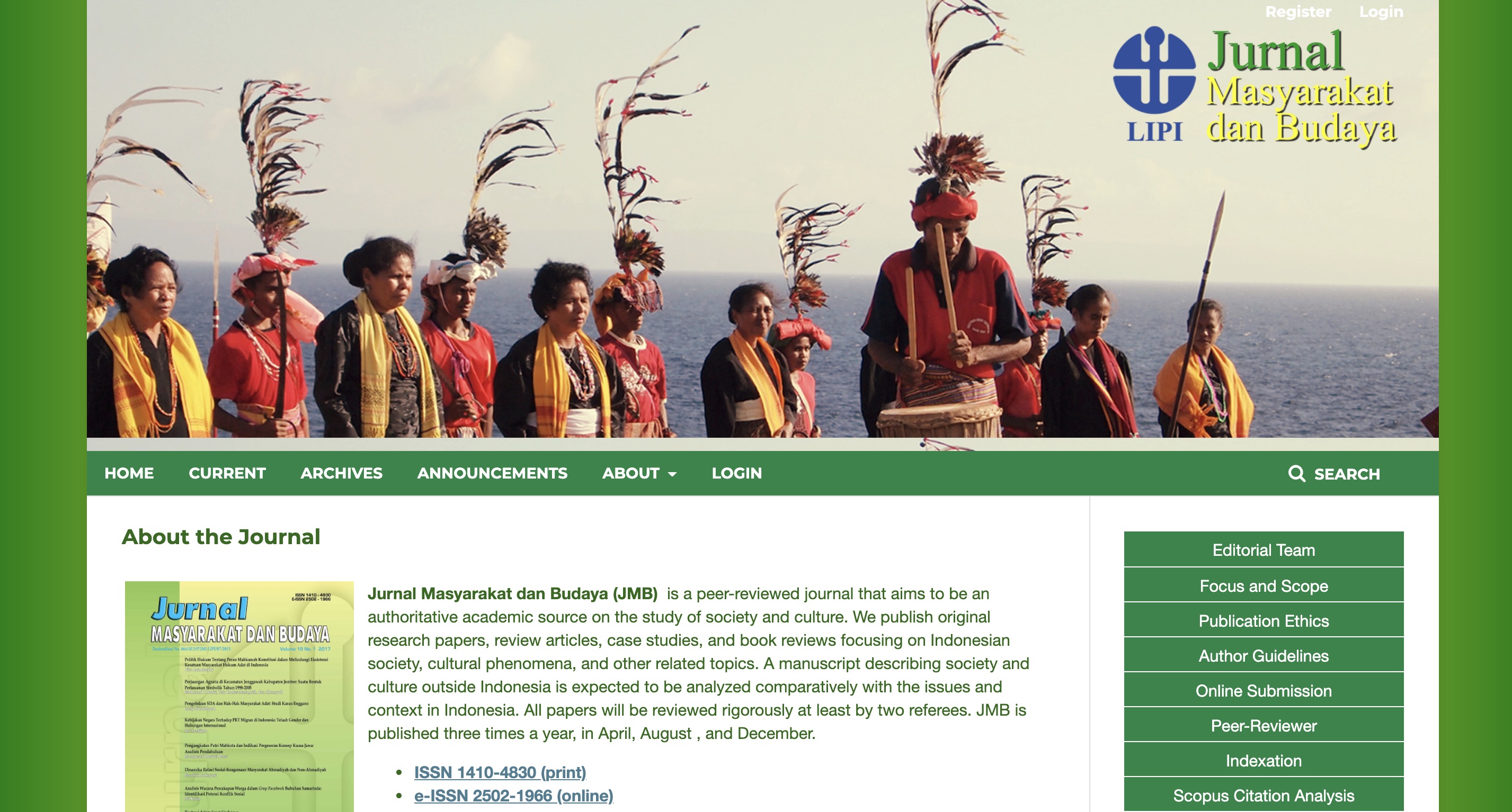 Jurnal Masyarakat dan Budaya (JMB) is a peer-reviewed journal that aims to be an authoritative academic source on the study of society and culture. We publish original research papers, review articles, case studies, and book reviews focusing on Indonesian society, cultural phenomena, and other related topics