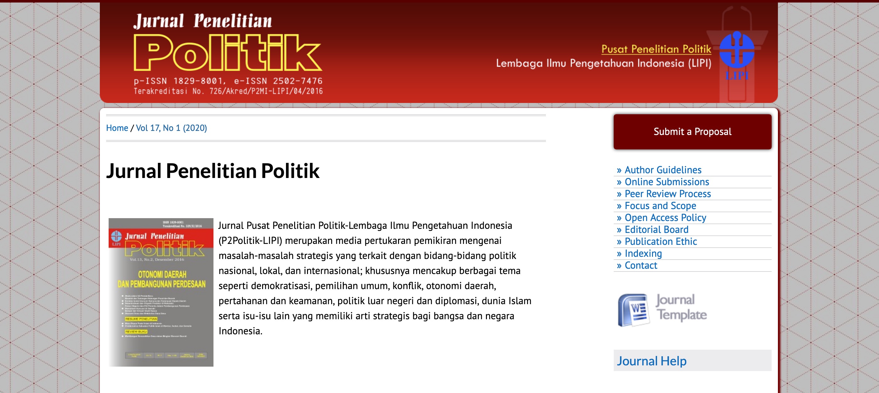 Jurnal Pusat Penelitian Politik-Lembaga Ilmu Pengetahuan Indonesia (P2Politik-LIPI) merupakan media pertukaran pemikiran mengenai masalah-masalah strategis yang terkait dengan bidang-bidang politik nasional, lokal, dan internasional