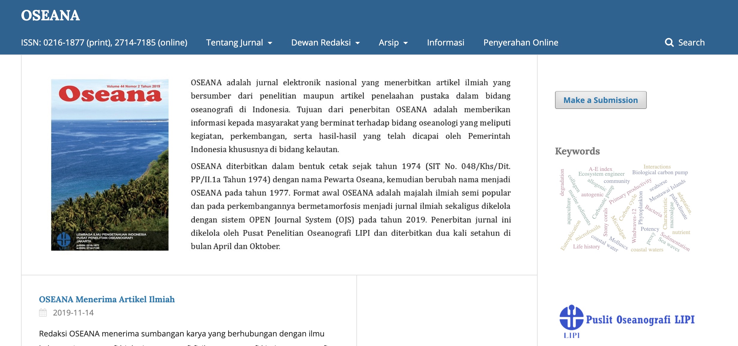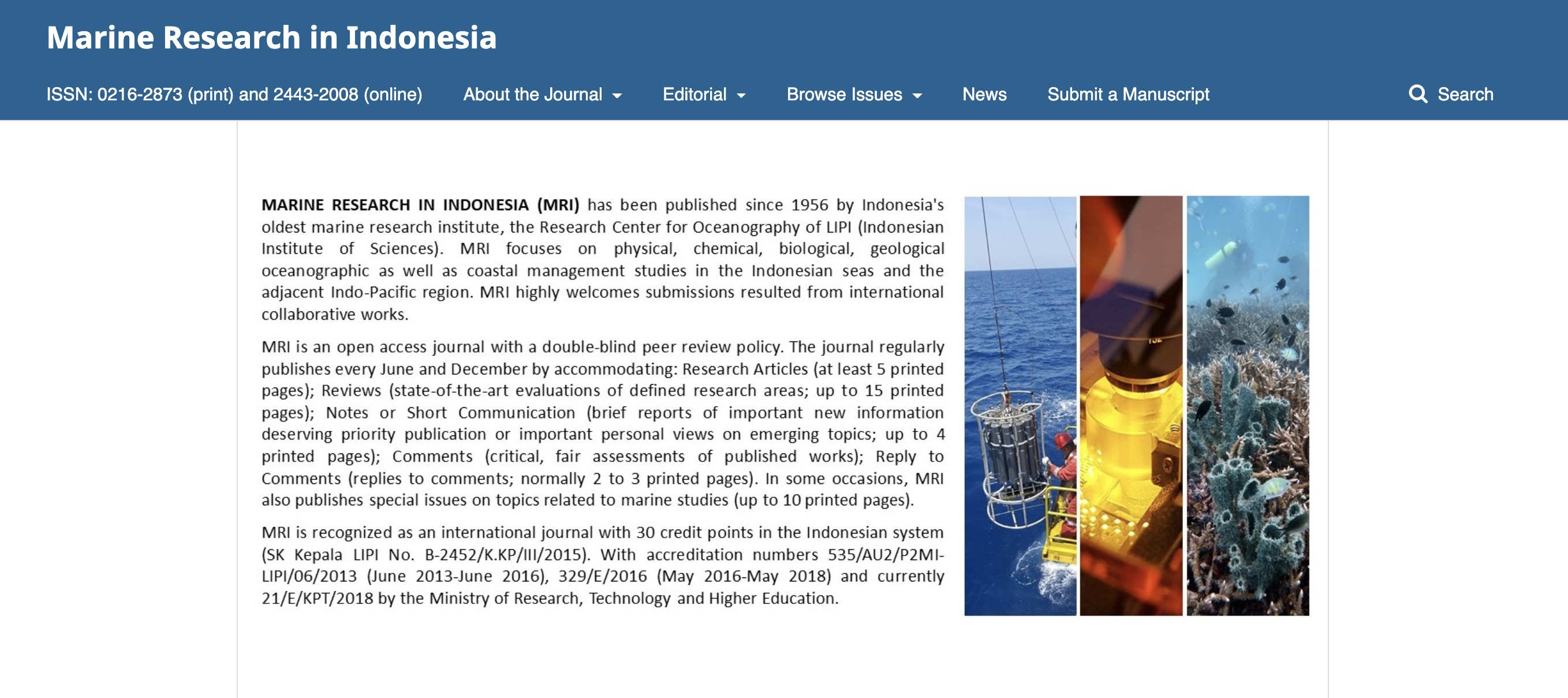 MRI focuses on physical, chemical, biological, geological oceanographic as well as coastal management studies in the Indonesian seas and the adjacent Indo-Pacific region. MRI highly welcomes submissions resulted from international collaborative works.