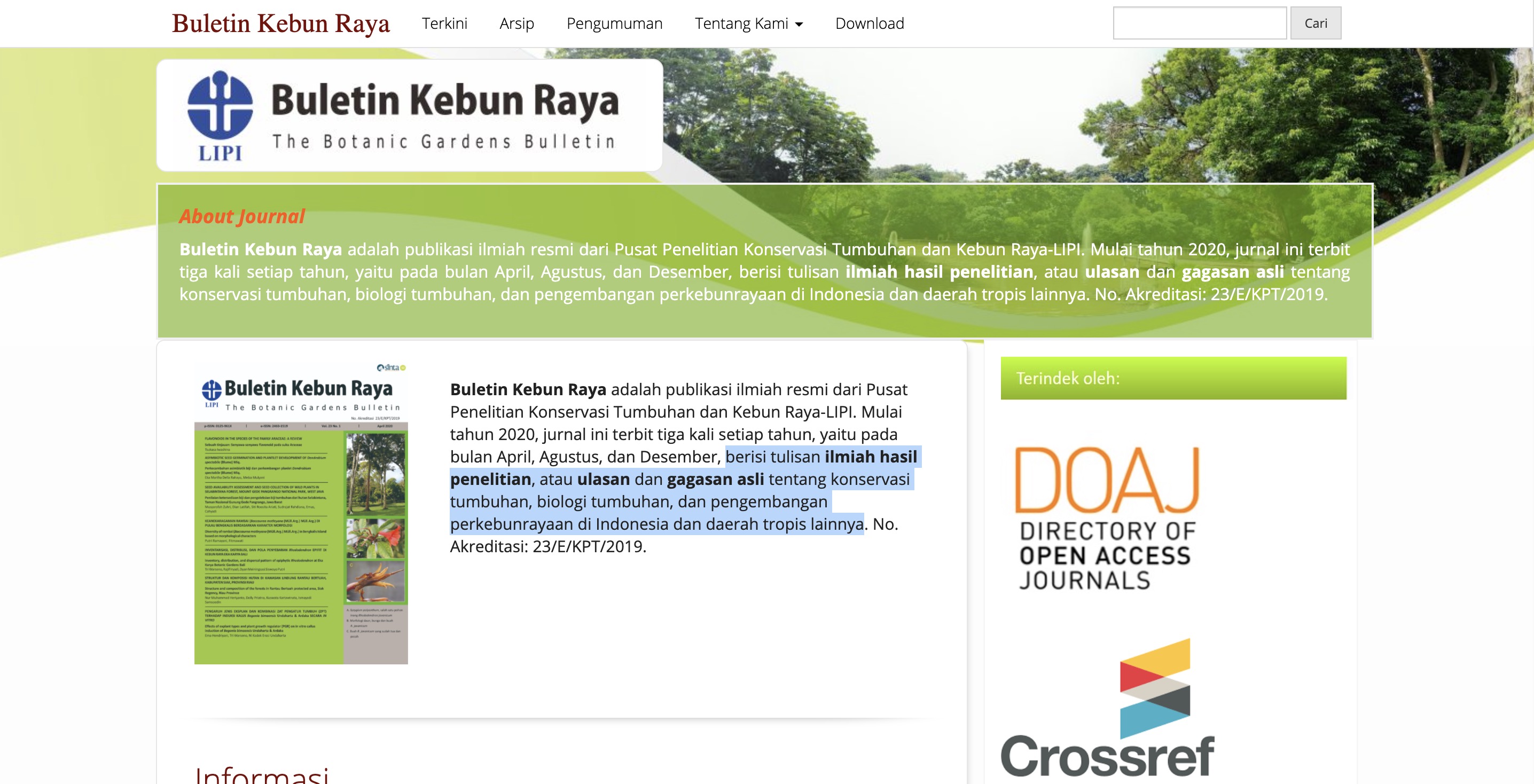 Buletin Kebun Raya adalah publikasi ilmiah resmi dari Pusat Penelitian Konservasi Tumbuhan dan Kebun Raya-LIPI yang berisi tulisan ilmiah hasil penelitian, atau ulasan dan gagasan asli tentang konservasi tumbuhan, biologi tumbuhan, dan pengembangan perkebunrayaan di Indonesia dan daerah tropis lainnya