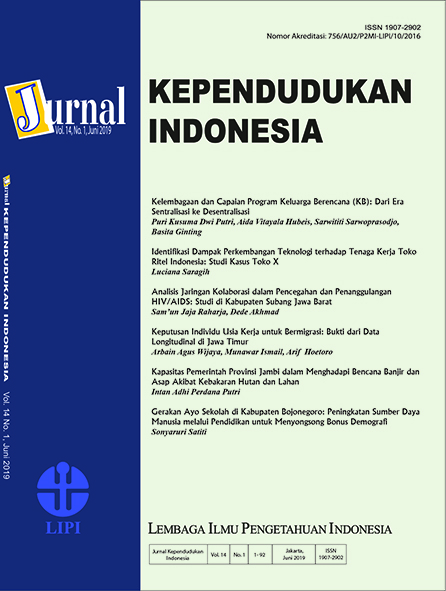 ISSN : 1907-2902 (Print) ISSN : 2502-8537 (Online) Nomor Akreditasi 30/E/KPT?2018 Jurnal Kependudukan Indonesia (JKI) is published by the Research Center for Population, Indonesian Institute of Sciences (PPK-LIPI).JKI publishes research articles (in English and in Bahasa) and book reviews and publishes twice a year covering issue related to population studies. We are pleased to invite your participation to contribute article with various issues such as Population Mobility, Fertility, Mortality, Youth and employment, Family, Ageing, Population and Health, Human Resources; Employment; Education, Human Ecology, Population and Climate Change, Population and Disaster. | Â | Â  |