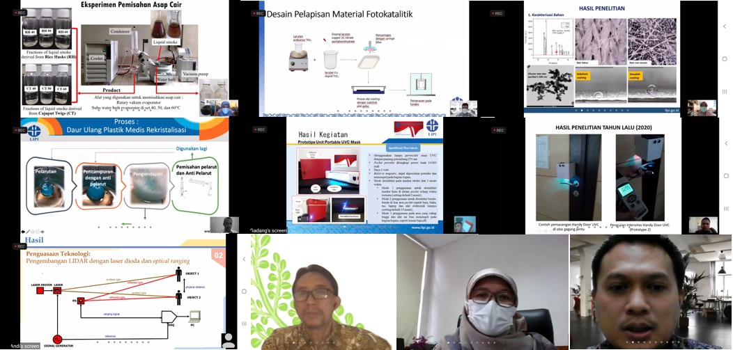Serpong, Humas LIPI. Dalam rangka memberikan umpan balik kepada para peneliti dan juga memberikan wawasan kegiatan penelitian terkait riset Covid-19, Kedeputian Ilmu Pengetahuan Teknik Lembaga Ilmu Pengetahuan Indonesia (IPT – LIPI) menyelenggarakan Sharing Session on Covid-19 Research pada Rabu (28/4) secara daring. Bersama peneliti klaster material dan instrumentasi antivirus, acara ini menghadirkan tujuh orang presenter dari Pusat Penelitian (P2) Fisika, P2 Kimia, serta P2 Metalurgi dan Material LIPI.