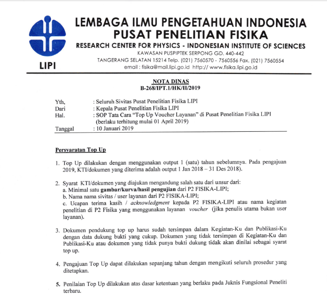 Laporan Kinerja Pusat Penelitian Fisika LIPI Triwulan IV Tahun 2019