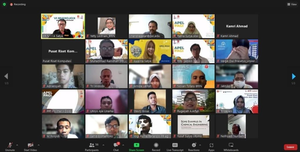 Cibinong – Humas BRIN. Badan Riset dan Inovasi Nasional (BRIN) melalui Pusat Riset Komputasi (PRK) menyelenggarakan Kolokium IV yang bertemakan Kimia Komputasi yang berlangsung secara virtual dan menghadirkan nara sumber yang berkompeten di bidangnya dan dipandu oleh Ir. Ika Atman Satya, Peneliti PRK BRIN pada Senin (25/7).