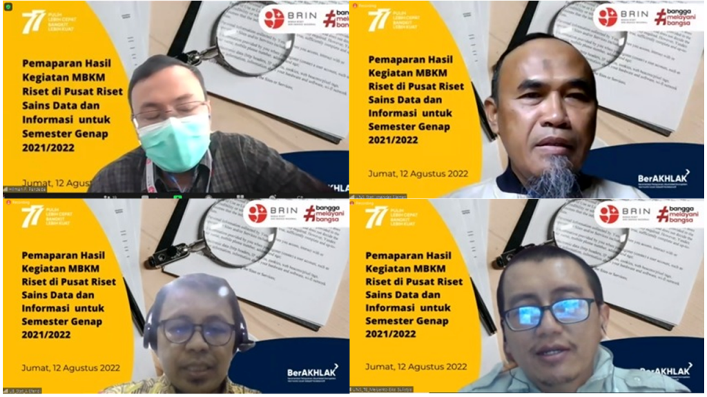 Bandung-Humas BRIN. Pusat Riset Sains Data dan Informasi - BRIN telah menyelenggarakan webinar pemaparan hasil kegiatan MBKM Riset yang telah berlangsung dalam Semester Genap 2021/2022. Dalam sambutannya, Kepala Pusat Riset Sains Data dan Informasi (PR SDI), Esa Prakasa menyampaikan bahwa webinar ini adalah media untuk pemaparan segala bentuk kegiatan yang telah dilakukan dan hasil-hasil yang telah dicapai.