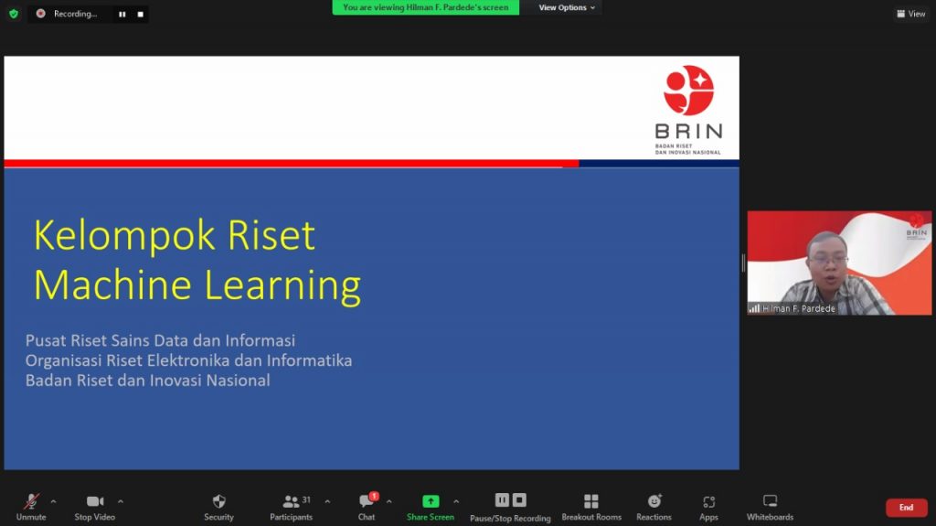 Hilman Ferdinandus Pardede, dari Kelompok Riset Pembelajaran Mesin (Machine Learning) menjelaskan bahwa machine learning research group bertujuan melakukan riset dan investigasi berkaitan dengan mesin learning, data mining, pengelolaan sinyal multimedia dan kecerdasan buatan. Machine learning adalah bidang ilmu informatika yang bertujuan mencari pola pada data, melakukan Inferensi (pengambilan keputusan atau kesimpulan) dari data berbasis pendekatan statistika dan Probabilistika. “Kami menginvestigasi berbagai tipe data yaitu : citra, speech, text, sertadata terstruktur dari berbagai bidang ilmu, antara lain: Enginering, Computing dan Science,” tegas Hilman.