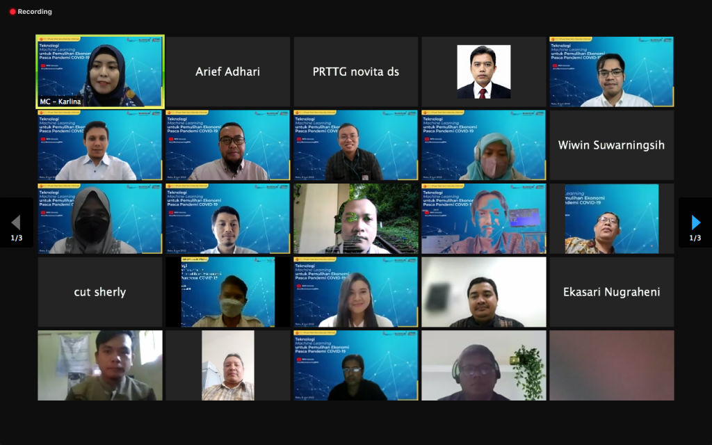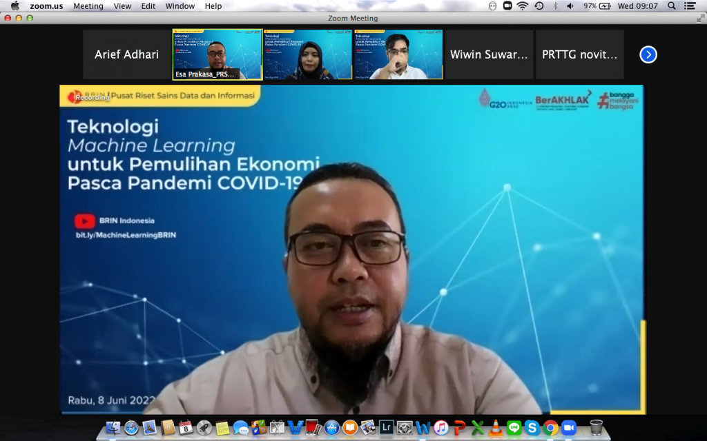 Bandung, Humas BRIN. Dalam menghadapi era revolusi Industri 4.O, penggunaan data seperti Machine learning, Artificial Intellegence menjadi hal yang penting untuk penggunaan mendukung pekerjaan yang effisien di industri yang berbasis digital, hal ini dapat menjadi suatu potensi untuk membantu dalam pemulihan ekonomi pasca pandemi Covid-19. Mendiskusikan hal tersebut Pusat Riset Sains Data dan Infomasi – BRIN menyelenggarakan webinar dengan topik “Teknologi Machine Learning untuk Pemulihan Ekonomi Pasca-Pandemi COVID-19.