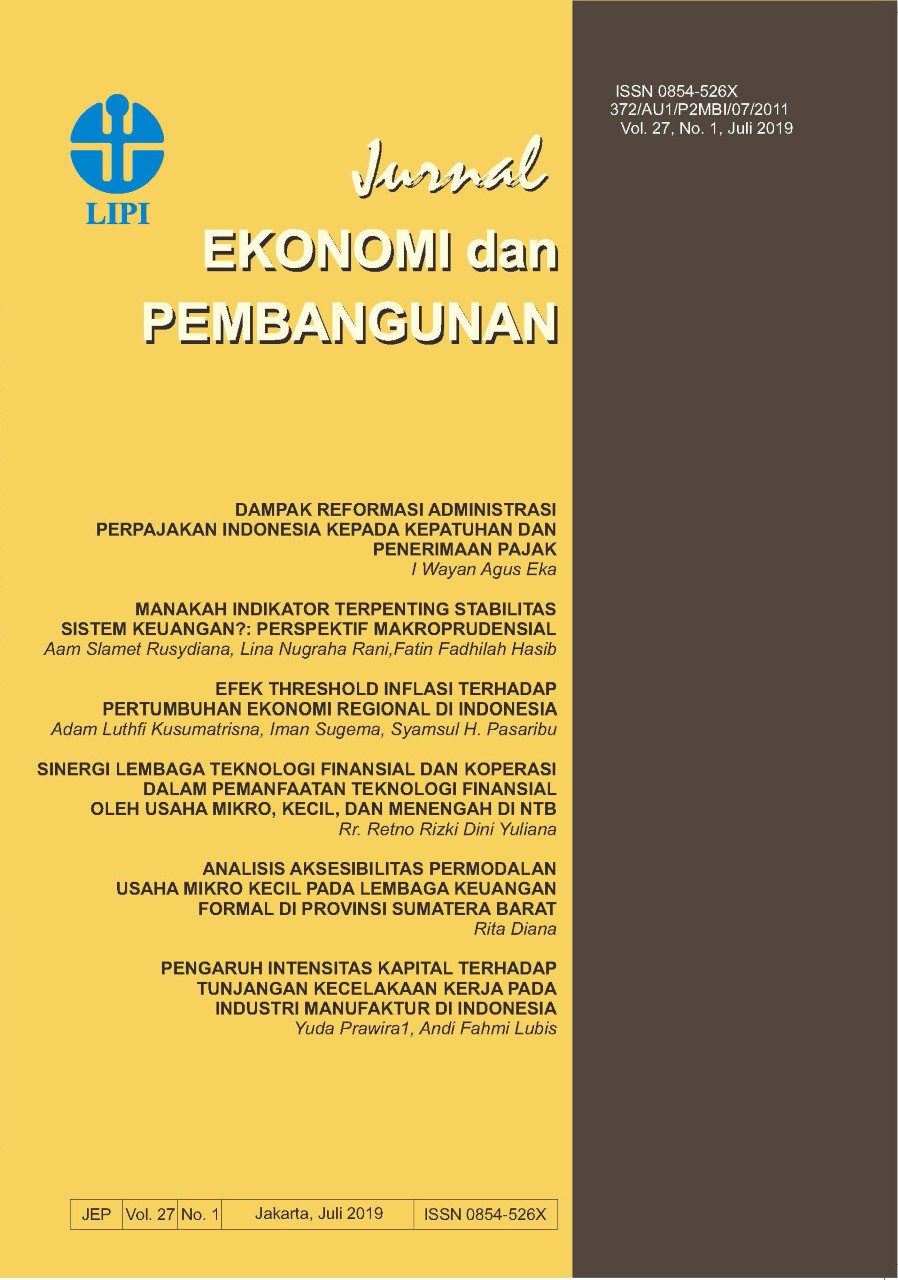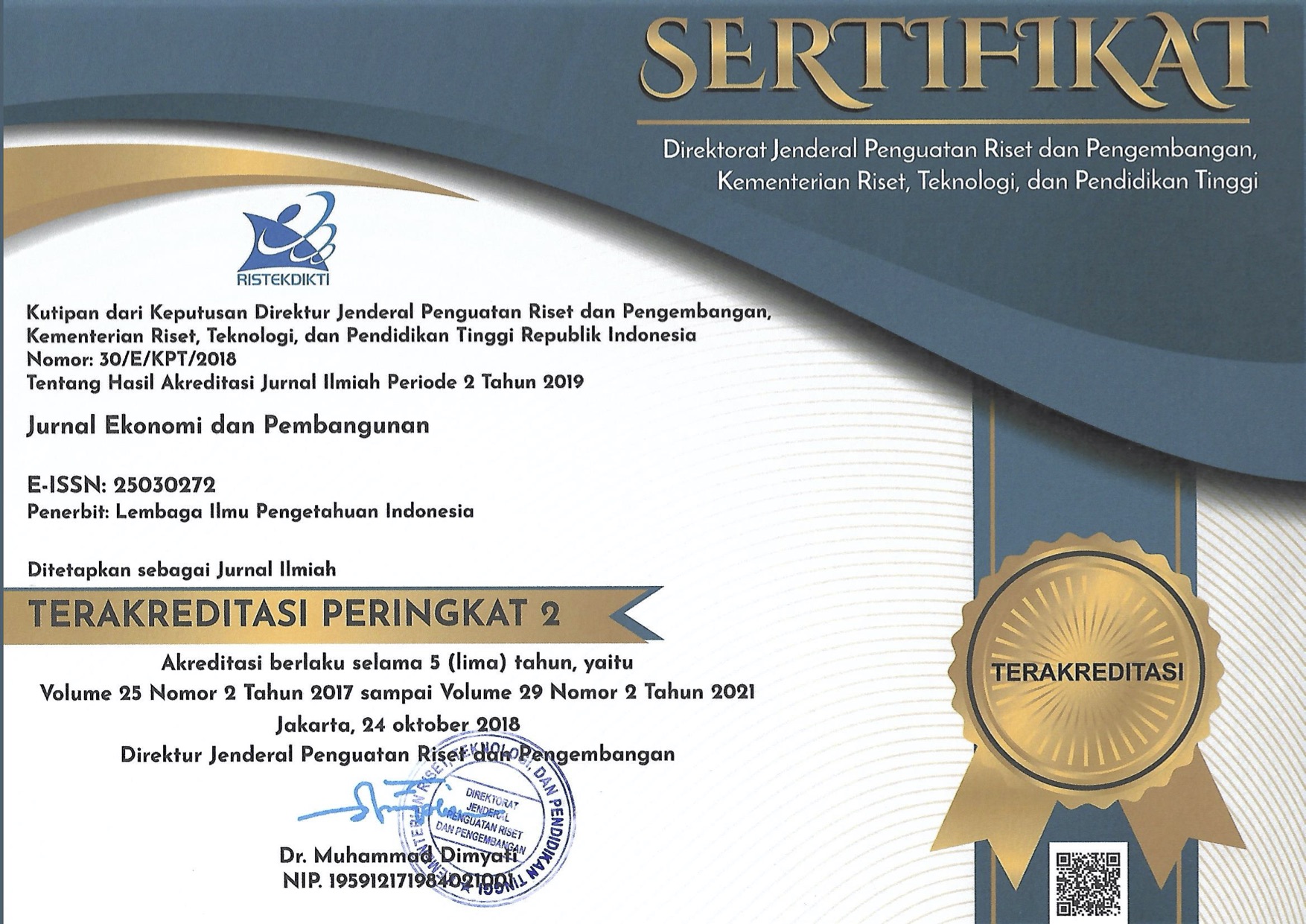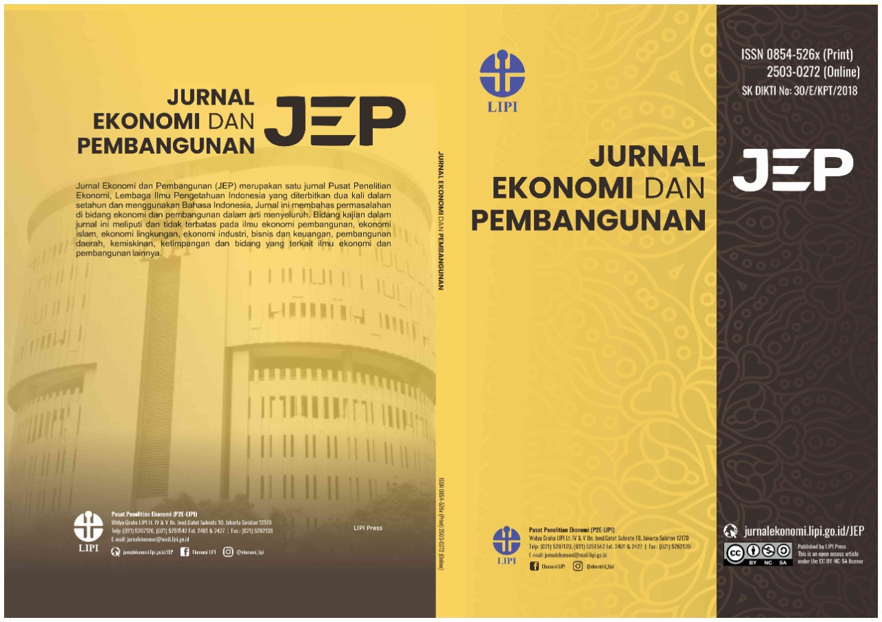 Jurnal Ekonomi dan Pembangunan (JEP), with registered number ISSN 0854-526x (Print) and 2503-0272 (Online), is published biannually (June and December) by Editorial Team of Economic Research Center, the Indonesian Institute of Sciences (P2E-LIPI). The journal was established in 1992. In 2016, Jurnal Ekonomi dan Pembangunan launched its online version by adopting Online Journal System to improve the quality of public services. Besides, Jurnal Ekonomi dan Pembangunan is not only a medium to disseminate studies conducted by Economic Research Center, the Indonesian Institute of Sciences, but also a place to deliver aspirations from scientific society in economic and development areas. Since 2017, Jurnal Ekonomi dan Pembangunan has been reaccredited by Ministry of Research, Technology, and Higher Education of the Republic of Indonesia based on SK DIKTI No: 30/E/KPT/2018 (2017-2021). In this period, Jurnal Ekonomi dan Pembangunan has achieved the second-grade level (Sinta 2) in Sinta (Science and Technology Index) managed by the Director General of Strengthening Research and Development, Ministry of Research Technology and Higher Education of the Republic of Indonesia. Jurnal Ekonomi dan Pembangunan (JEP), indexed by: |