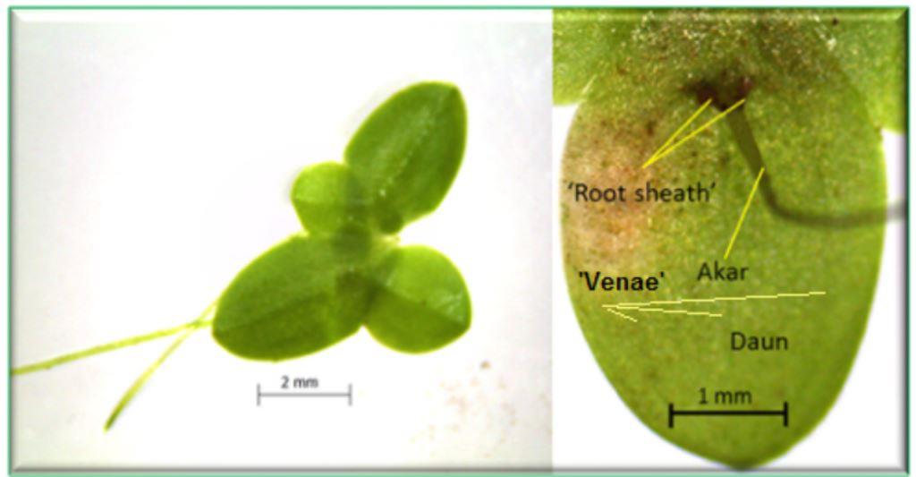 Satu rumpun lemna (kiri) dan ‘root sheath’ dan ‘venae’ sebagai penciri jenis Lemna perpusilla Torr (Foto: T. Chrismadha).