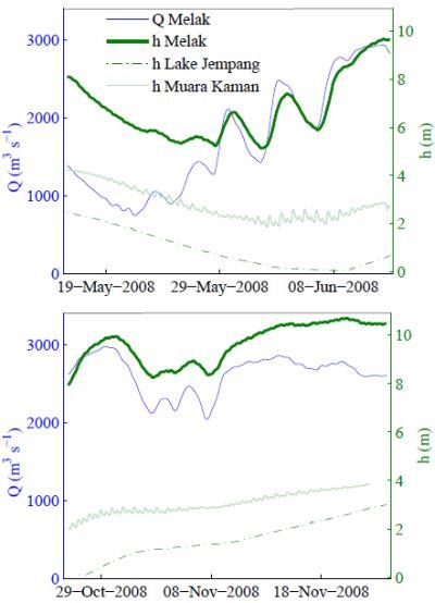 Tinggi muka air dan debit pada saat pengosongan danau (atas) dan saat pengisian danau (bawah). Muara Kaman, lokasi dimana sinyal pasang surut teramati selama periode penelitian terletak di sebelah hilir dari Danau kaskade Semayang, Melintang, Jempang sekitar 170 km dari stasiun pengukuran debit di Melak (Hidayat dkk., 2011).