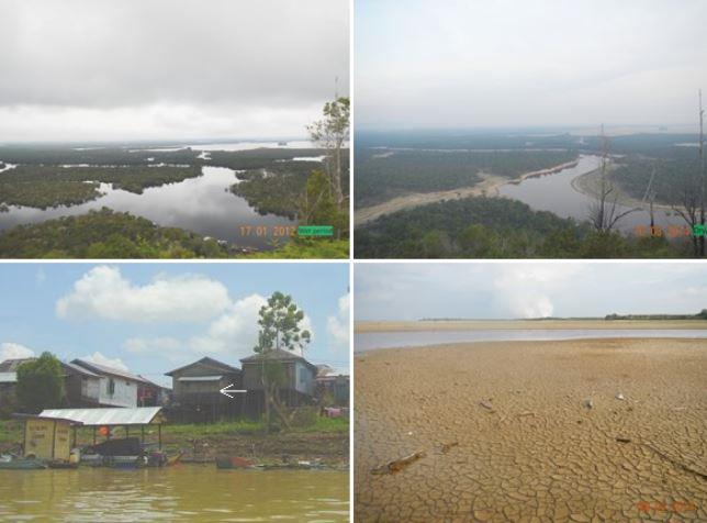 Kondisi kawasan Taman Nasional Danau Sentarum pada saat air tinggi (kiri atas), pada saat air rendah (kanan atas dan kanan bawah), dan kondisi permukiman di kawasan Mahakam bagian tengah. Tanda panah menunjukkan ketinggian air tertinggi (Hidayat dkk., 2017).