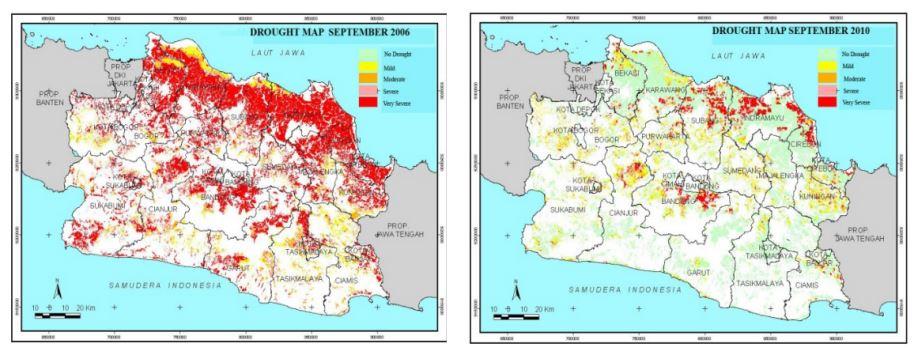 Peta kekeringan di Jawa Barat tahun 2006 (kiri) dan tahun 2010 (kanan) berdasarkan