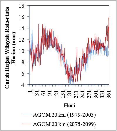harian (kiri) dan rata-rata bulanan (kanan) dengan menggunakan data AGCM 20-km.