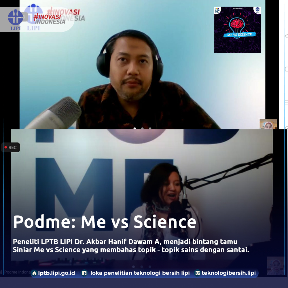 Bandung, Humas LIPI. LIPI berkolaborasi dengan Podme.id menggelar program talk show dengan konsep Siniar bertajurk Me vs Science. Kolaborasi ini merupakan renjana LIPI dan juga Podme.id untuk menghadirkan konten informasi sains yang fleksibel dan santai. Para pendengarnya bisa mengikuti obrolan sains dengan lebih mudah dipahami. Acara ini dipandu oleh Ana Chusdarmawan. Pada kesempatan kali ini, Peneliti LPTB LIPI Dr. Akbar Hanif Dawam A menjadi narasumbernya, Kamis (5/2). “Sehari – hari kita tidak bisa lepas dari material,” ujar Dawam membuka dialog santainya mengenai ilmu material.