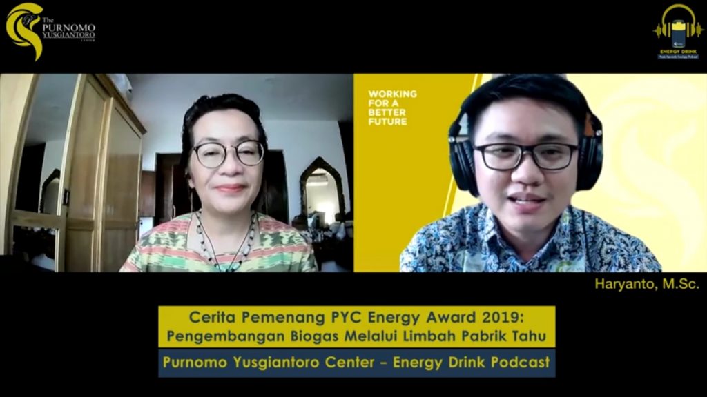 Bandung, Humas LIPI. Pada Tahun 2019 Purnomo Yusgiantoro Center (PYC) menganugerahkan penghargaan PYC Energy Award 2019 kepada Loka Penelitian Teknologi Bersih LIPI atas perannya dalam pengembangan masyarakat melalui inovasi di sektor energi. Menjelang PYC Energy Award 2021 yang akan berlangsung Oktober mendatang, PYC menghadirkan Podcast Energy 24/7 yang membahas topik – topik terkini mengenai pengembangan energi di Indonesia. Salah satu yang menjadi pembicara pada siniar ini adalah Dr. rer. nat Neni Sintawardani peneliti bidang keahlian Sanitation and Waste Treatment, Jumat (26/2). Dipandu oleh Haryanto, kepada para pendengar, Neni menceritakan pengalamannya mengenai Biogas pengelolaan limbah produksi tahu terbesar yang pernah ia dan tim bangun.