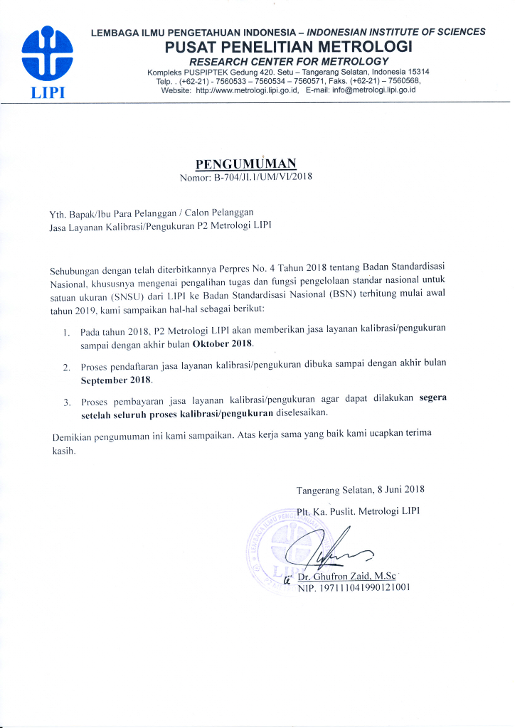 | 4. | Pelanggan yang diterima wajib membawa alat ke Puslit Metrologi LIPI antara tanggal 21 sd 28 September 2018. Lewat tanggal tersebut permintaan layanan dianggap Batal. |