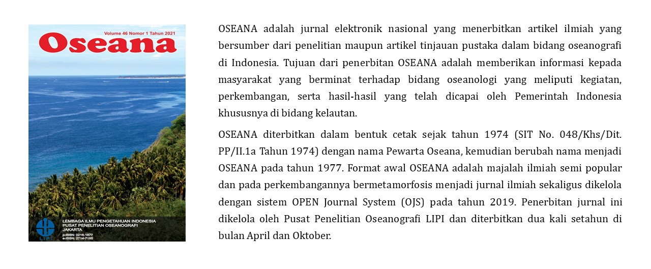 Penulis diundang untuk mengirimkan naskah tidak kurang dari 10 halaman dan tidak lebih dari 25 halaman melalui website ini. Naskah ditulis sesuai format pada Petunjuk untuk penulis. Mulai dari pengiriman naskah sampai dengan penerbitan, OSEANA tidak memungut biaya.