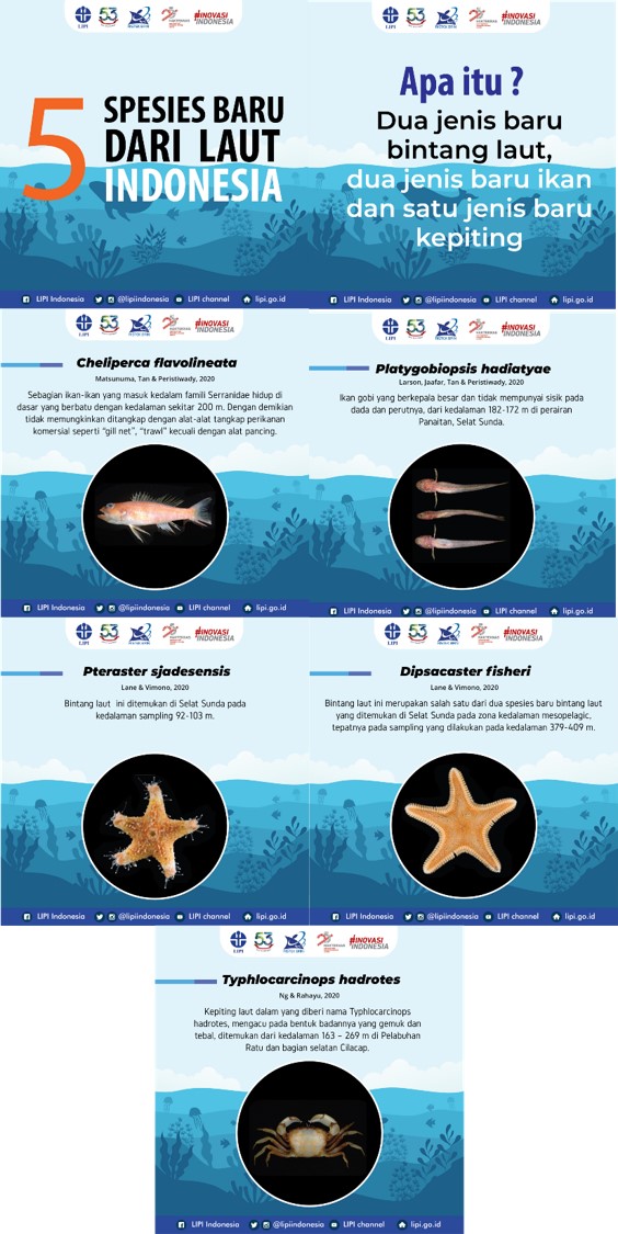 Kekayaan jenis biota laut Indonesia kembali bertambah dengan ditemukannya dua jenis baru bintang laut, dua jenis baru ikan dan satu jenis baru kepiting. Kelima biota laut tersebut diperoleh saat ekspedisi laut dalam (SJADES: South Jawa Deep Sea Expedition) yang merupaka ..... Selengkapnya