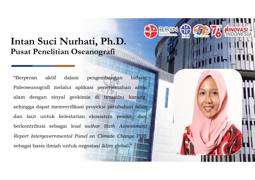 Pertama, Intan Suci Nurhati, menerima penghargaan atas dedikasinya dalam pengembangan bidang paleoseonografi. “Intan berperan aktif dalam pengembangan bidang Paleoseonografi melalui aplikasi penerjemahan arsip alam dengan sinyal Geokimia di terumbu karang, sehingga dapat memverifikasi proyeksi perubahan iklim dan laut untuk kelestarian ekosistem pesisir dan berkontribusi sebagai Lead Author Sixth Assessment Report Intergovernmental Panel on Climate Change PBB sebagai basis ilmiah untuk negosiasi iklim global.