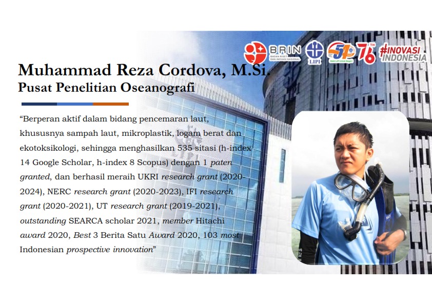 LIPI, diberikan kepada Muhammad Reza Cordova. Pengalaman Riset, Reza menekuni bidang pencemaran laut, khususnya sampah laut, mikro plastik, logam berat dan ekotoksikologi, hingga menghasilkan 535 sitasi (h-index 14 Google Scholar, h-index 8 Scopus) dengan 1 paten granted, dan berhasil meraih UKRI research grant (2020-2024), NERC research grant (2020-2023), IFI research grant (2020-2021), UT research grant (2019-2021), outstanding SEARCA scholar 2021, member HITACHI Award 2020, Best 3 Berita Satu Award 2020, 103 Most Indonesian Prospective Innovation. (rdn,ags/Ed:mtr)