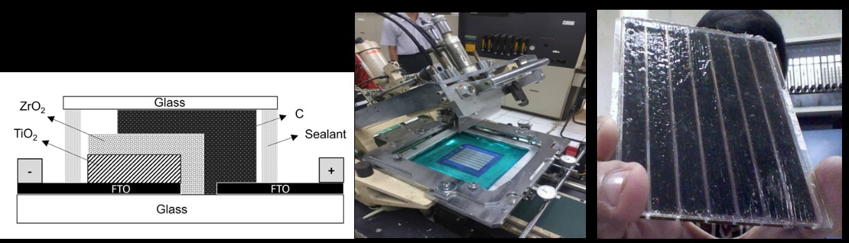Figure. (Left) Device structure of monolithic DSSC, (middle) screen printing of large area monolithic DSSC module, (right) monolithic DSSC device prototype using carbon-based material as counter electrode