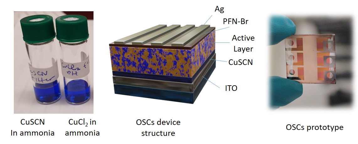 Figure. (left) CuSCN and CuCl2 solution dissolved in aq, ammonia used for hole transport layer (HTL) for OSCs, (middle) Device structure of OSC employing CuSCN as HTL, (right) OSCs device prototype using CuSCN as HTL.
