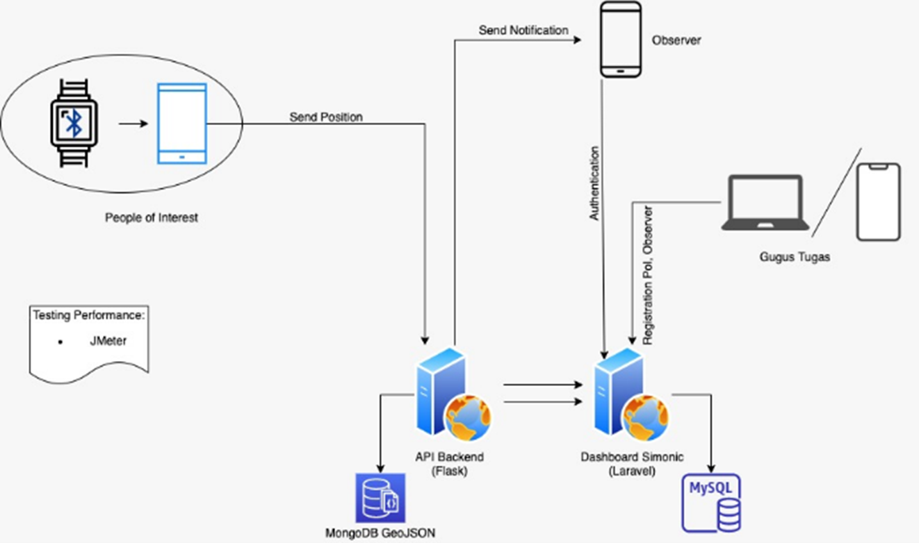 During the COVID-19 pandemic, wearable devices integrated with information systems can be used to monitor individuals in ODP (Orang Dalam Pantauan) or PDP (Pasien Dalam Pengawasan) status. ODP and PDP individuals who undergo quarantine often violate quarantine rules to stay at home for 14 days. Enforcement of regulations during the quarantine process must be carried out to ensure that individuals remain in a confined area (home) during the quarantine period. It is necessary to develop a device that provides ODP/PDP/OTG(Orang Tanpa Gejala) to perform self-isolation correctly and adequately.
