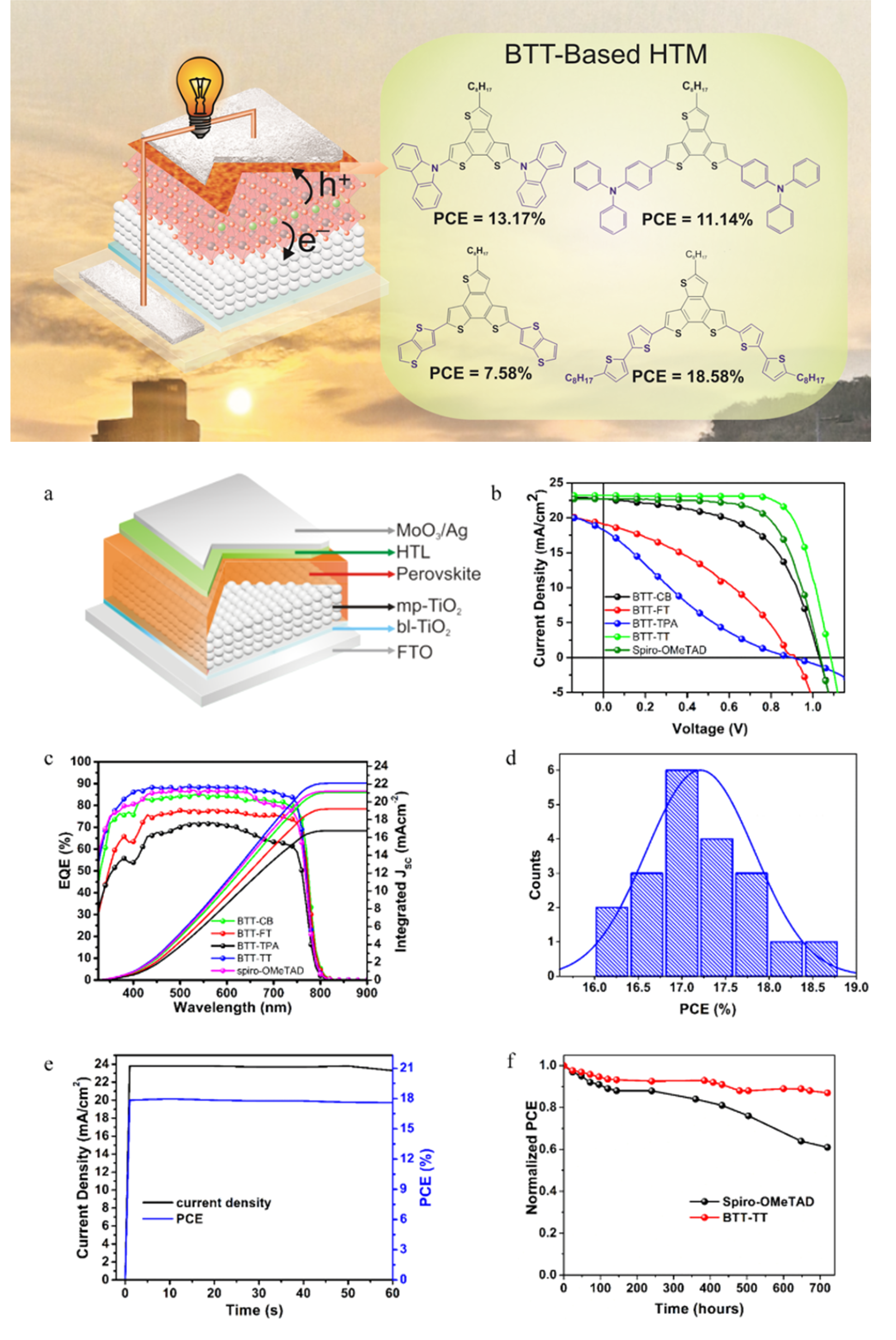 In this study, we synthesized a series of small-molecule benzotrithiophenes (BTTs) and used them as hole transporting materials (HTMs) in perovskite solar cells (PSCs). The asymmetric benzo[2,1-b:-3,4-b′:5,6-b″]trithiophene unit was used as the central core to which were appended various donor groups, namely, carbazole (BTT-CB), thieno thiophene (BTT-FT), triphenylamine (BTT-TPA), and bithiophene (BTT-TT). The extended aromatic core in the asymmetric BTT provided full planarity, thereby favoring intermolecular π-stacking and charge transport. The physical, optical, and electrical properties of these small-molecule HTMs are reported herein. BTT-TT displayed good crystallinity and superior hole mobility, when compared with those of the other three HTMs, and formed smooth and uniform surfaces when covering the perovskite active layer. Accordingly, among the devices prepared in this study, a PSC incorporating BTT-TT as the HTM achieved the highest power conversion efficiency (18.58%). Moreover, this BTT-TT-containing device exhibited good stability after storage for more than 700 h. Thus, asymmetric BTTs are promising candidate materials for use as small-molecule HTMs in PSCs