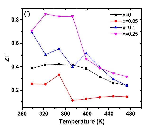 Dy-doped Bi2Te3 pellets with three different molar ratios between the precursors BiCl3 and DyCl3∙6H2O (x = 0.05, 0.1, and 0.25) were prepared by hydrothermal and carbon burial sintering. The excess of Dy ions in the highly doped samples (x = 0.25) remarkably increased the Seebeck coefficient, reduced the thermal conductivity, and increased ZT more than twofold in the temperature range of 323–375 K compared to pristine Bi2Te3. At low Dy concentrations (x = 0.05 and 0.1), the Dy ions substituted the TeBi antisites and then intercalated between the Bi2Te3 interlayers at higher concentration. The Dy ions act as both the phonon and charge carrier scattering centers which increase the scattering factor and decrease the point defect scattering relaxation time γ. The increase in the number of Te vacancies and the higher sound velocity of Dy (2710 m/s at 20 °C) compared to that of Bi (1790 m/s) considerably contribute to the improvement of the thermoelectric performance of pristine Bi2Te3.
