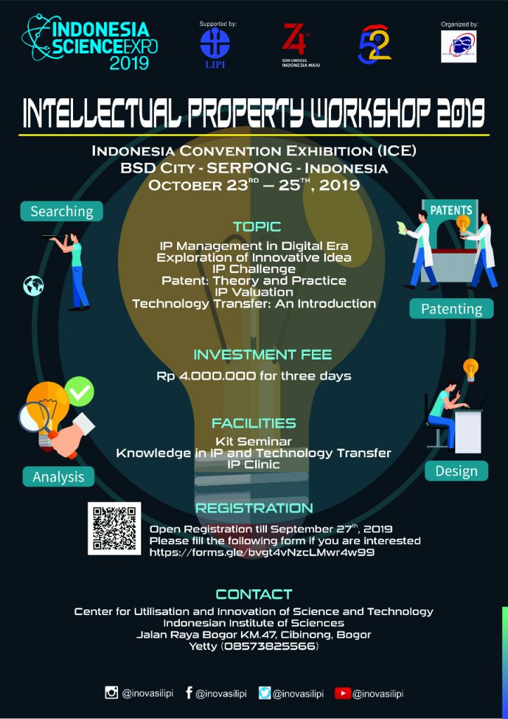 Jika sahabat inovasi ingin mendapat pengetahuan mengenai proses penyiapan dan aplikasi pendaftaran paten, termasuk merancang klaim paten untuk didaftarkan agar mendapat hak kekayaan intelektual, ikuti Intellectual Property Workshop 2019 yang akan diadakan pada 23 – 25 Oktober 2019 di ICE BSD Serpong.