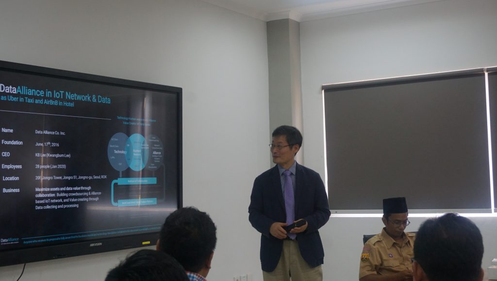 Dr. Jeong Hyop Lee, mewakili perusahaan WISER Co. Ltd. dan Data Alliance memberikan presentasinya untuk menjelaskan teknologi smart city yang telah diterapkan di Korea Selatan. Dalam paparannya, Lee mengatakan bahwa pengembangan berbasis IoT dalam pelayanan masyarakat, pertama-tama diperlukan pengumpulan data dari berbagai sumber. Data alliance akan masuk apabila smart city sudah terlaksana, dimana data sudah terkumpul dan dapat diolah sedemikian rupa.