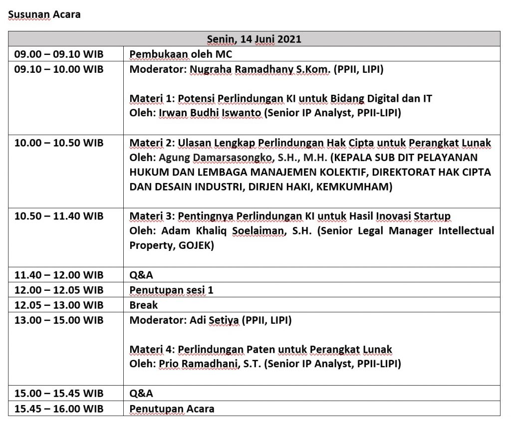 Oleh sebab itu, Bidang Manajemen Kekayaan Intelektual, Pusat Pemanfaatan Inovasi dan IPTEK, LIPI akan melaksanakan Webinar “Menggali Pelindungan Kekayaan Intelektual Bidang Teknologi Informasi dan Digital”. “