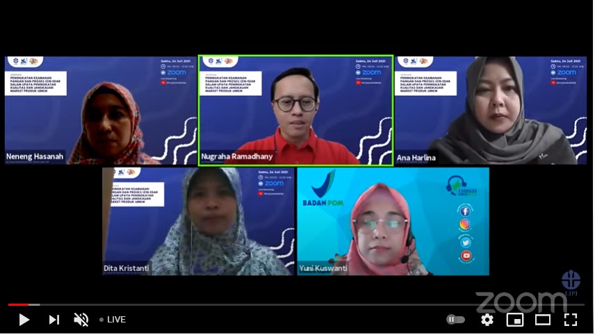 Cibinong. Humas LIPI. Keamanan pangan pada produk UMKM merupakan hal yang sangat penting. Hal ini adalah sebuah kondisi maupun upaya untuk mengamankan produk pangan dari pencemaran dan kontaminasi baik dari kontaminiasi biologi, kimia dan benda lain yang dapat mengganggu kualitas dan keamanan pangan. Sehingga diperlukan pemahaman bagi pelaku usaha untuk dapat mengolah produk pangan dengan baik agar terjamin keamanan dan kehigienisannya. Daya tahan produk pangan merupakan salah satu hal yang juga dibutuhkan bagi UMKM agar dapat meningkatkan dan memperluas jangkauan penjualan. Hal ini dapat diberikan kepada UMKM melalui informasi standar pengolahan, peralatan, kemasan, dan bahan-bahan yang aman bagi produk pangan olahan untuk meningkatkan daya tahan produk. Untuk itu Pusat Pemanfaatan dan Inovasi Iptek (PPII) Lembaga Ilmu Pengetahuan Indonesia (LIPI) menyelenggarakan Webinar Peningkatan Pangan dan Proses Izin Edar dalam Upaya Peningkatan Kualitas dan Jangkauan Market Produk UMKM pada Sabtu (24/7) secara daring. Adapun tujuan dari webinar ini antara lain memberikan informasi kepada UMKM fasilitas-fasilitas / alat yang dapat dipergunakan masyarakat (khususnya UMKM), memberikan informasi proses untuk meningkatkan keamaman pangan pada produk UMKM dan memberikan pemahaman dan informasi tentang proses izin edar Badan POM MD dan P-IRT.