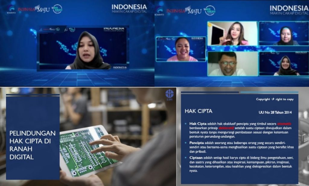 Analis Kebijakan dan Koordinator Pelaksana Fungsi Manajemen KI, Pusat Pemanfaatan dan Inovasi Iptek (PPII) Lembaga Ilmu Pengetahuan Indonesia (LIPI), Harini Yaniar mengatakan bahwa fenomena yang terjadi dalam konteks literasi digital memungkinkan karya hak cipta berupa buku, jurnal, majalah, karya tulis lainnya, video, rekaman, lagu, film, gambar, lukisan, foto sangat potensial terjadi pengunduhan illegal. “ Perlu kita rujuk Undang-Undang Nomor 28 Tahun 2014 tentang definisi hak cipta, pencipta dan ciptaan agar paham dulu acuan dasar perlindungan hak cipta di ranah digital,” ungkapnya saat menjadi narasumber Webinar “Indonesia Makin Cakap Digital” bertema “Sejahtera Lewat Dunia Digital” yang dihelat secara virtual dari Toraja Utara, Sulawesi Selatan oleh Kementerian Komunikasi dan Informatika Republik Indonesia, pada Jumat (30/7).