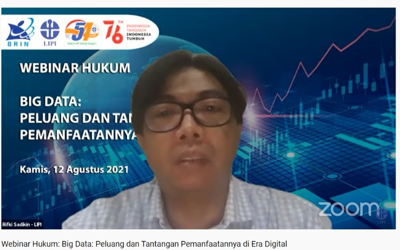 Cibinong. Humas LIPI. Peluang dan tantangan pemanfaatan big data di Indonesia khususnya di era digital dapat dilihat dari berbagai sisi, yakni kebijakan yang dikeluarkan oleh pemerintah, peluang dan tantangan big data dalam mendukung peningkatan layanan diberbagai sektor, penggunaan big data untuk keamanan data pengguna layanan serta urgensi, dan perlindungan privasi data dalam era big data. Untuk membahas hal-hal itulah sebuah webinar hukum tentang “Big Data: Peluang dan Tantangan Pemanfaatannya di Era Digital” dihelat Lembaga Ilmu Pengetahuan Indonesia (LIPI), pada Kamis (12/8).