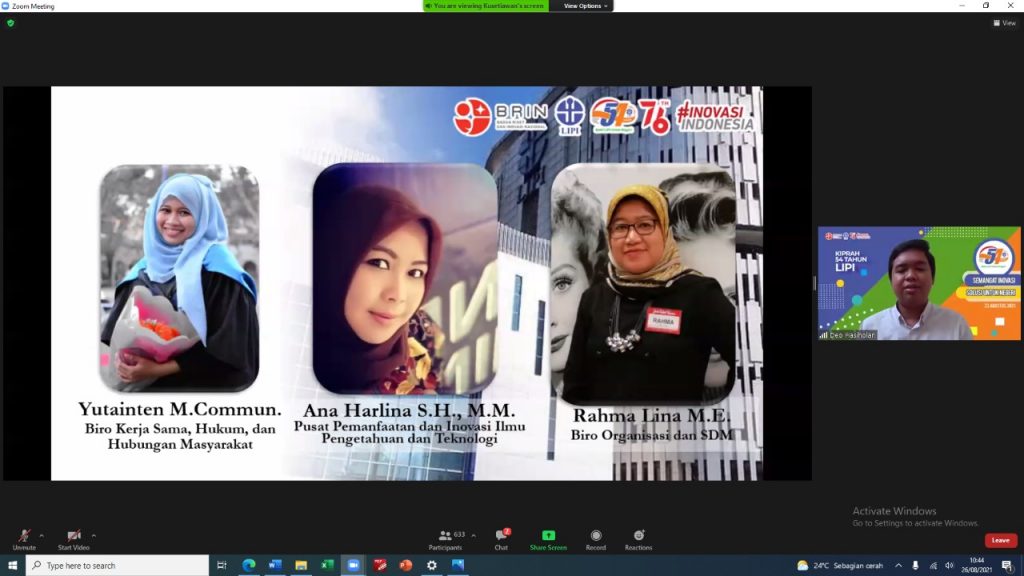 Berbagai rangkaian acara terselenggara dalam rangka peringatan HUT LIPI dan pada Kamis (26/08) LIPI kembali melaksanakan “Talkshow Riset dan Inovasi di Dunia Hyperconnected” dan penyerahaan penghargaan kepada sivitas LIPI secara virtual dan dihadiri oleh Kepala Badan Riset dan Inovasi Nasional (BRIN), Kepala LIPI, seluruh pimpinan, dan sivitas di lingkungan LIPI.