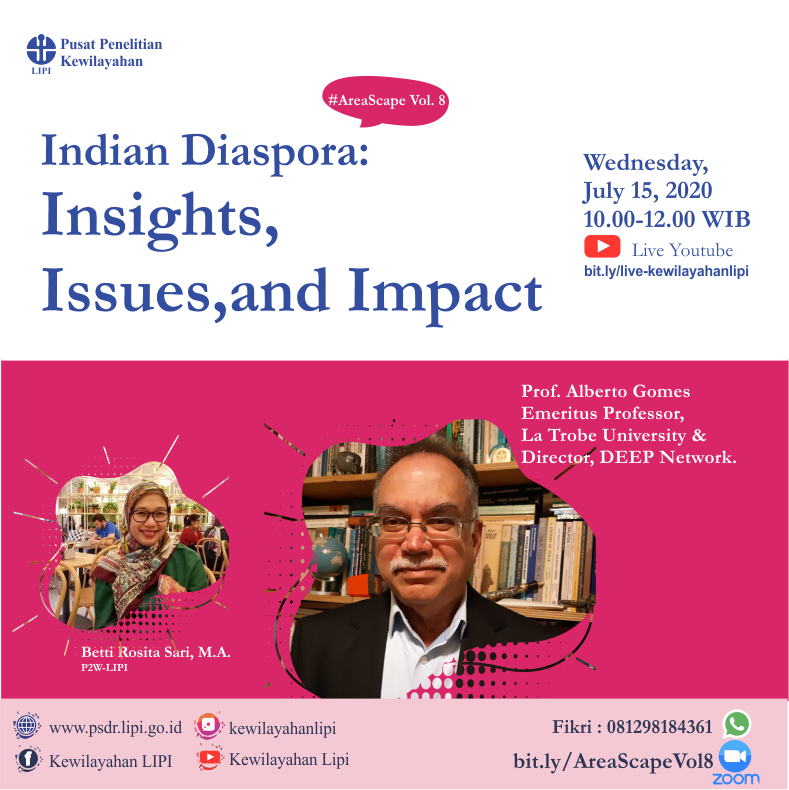 Prof. Alberto Gomes , Emeritus Professor, La Trobe University & Director, DEEP Network akan berbincang dengan Betti Rosita Sari, M.A. Researcher P2W - LIPI dari Pusat Penelitian Kewilayahan LIPI dalam #AreaScape Vol 8 . Diskusi nanti akan membahas topik "Indian Diaspora: Insights, Issues, and Impact".